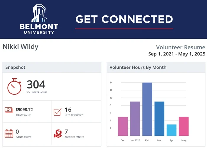 Awarded a Presidential Scholarship at Belmont University, Nikki volunteered over 40 hours per semester most semesters. She volunteered at Belmont events and Nashville Public Library, but most of her hours were spent with The Store, Nashville, TN.